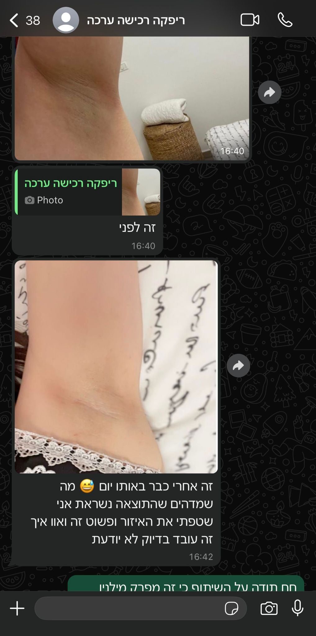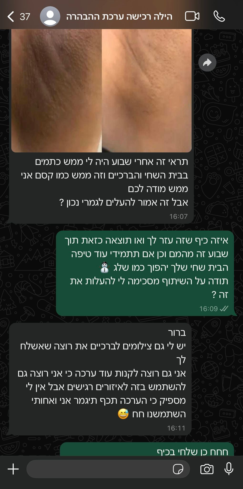 חיפשתי מלא פתרונות בעבר להבהרה וראיתי מלא סרטונים ברשת למוצרים שונים וניסיתי לקנות וזה לא באמת עבד לי עד שמצאתי את המודעה שלכם בהתחלה הייתי סקפטית אבל אחרי שקפצתם לי מלא אמרתי יאלה ניתן הזדמנות אחרונה ולגמרי לא מתחרטת זה הייתה הקנייה הכי שווה לי ב 5 שנים האחרונות המוצר הבהיר לי גם את השחורים במרפקים וגם בתי השחי ראיתי תוצאות כבר מהשימוש הראשון שזה ממש הדהים אותי