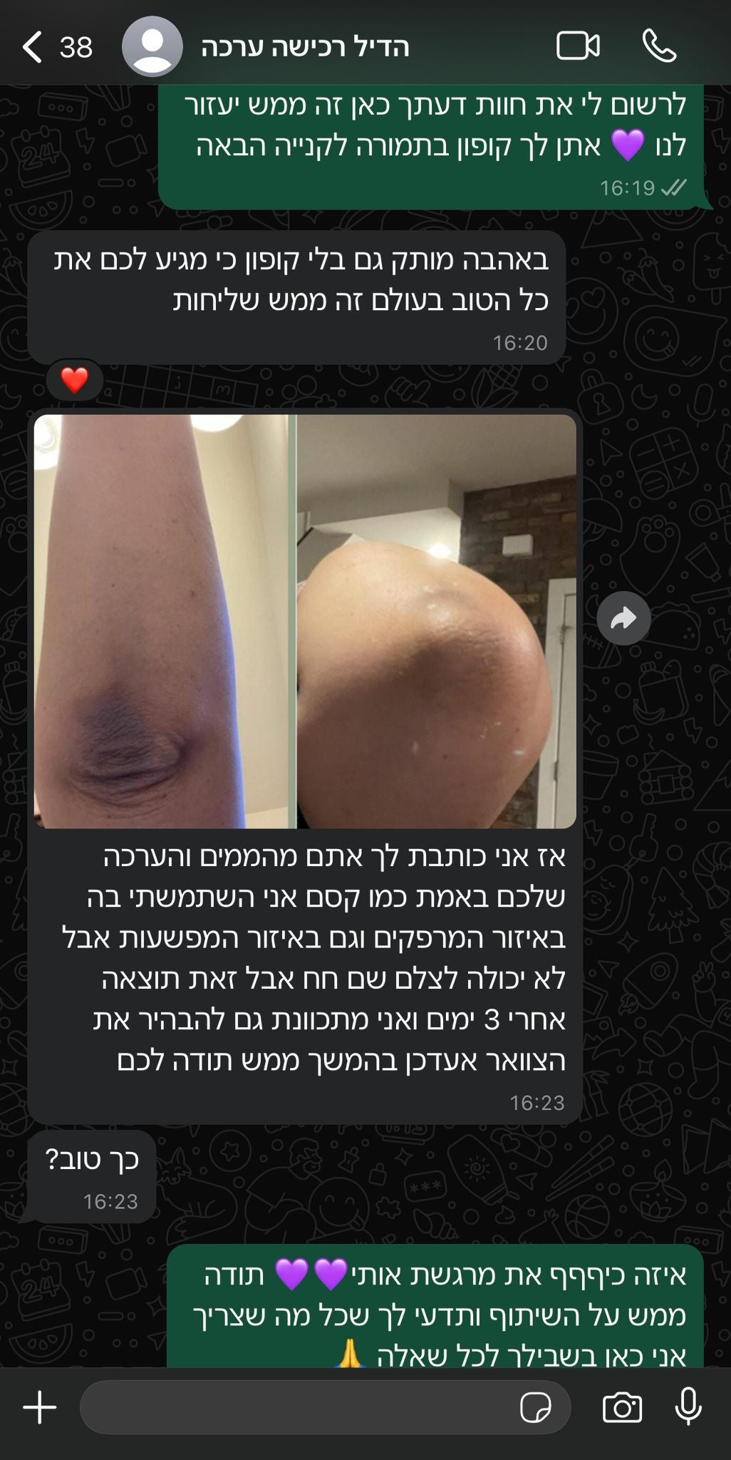 מודה שהערכה הזאת שינתה לי את החיים הייתי ממש מתביישת מהכהויות שהיו לי בבית שחי הרגשתי חסרת בטחון לשבת עם חברות שלי כשאני לובשת חולצה קצרה אבל המוצר הזה העלים לי את הכהויות לגמרי אחרי שלושה שימושים וזה לגמרי העלה לי את הבטחון היום אני לובשת מה שבא לי ומרימה ידיים בכיף בכל ישיבה עם חברות אני סופר ממליצה